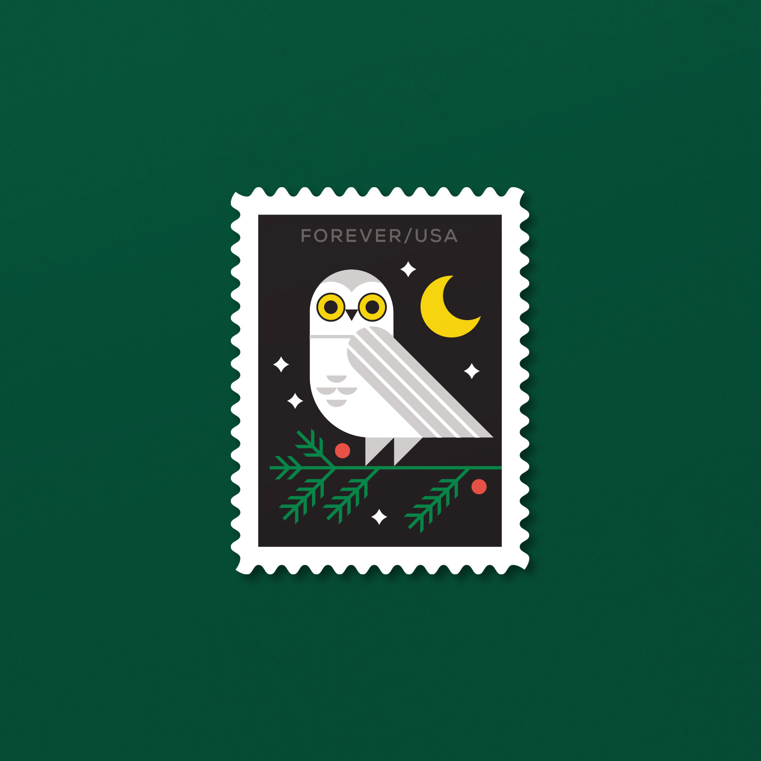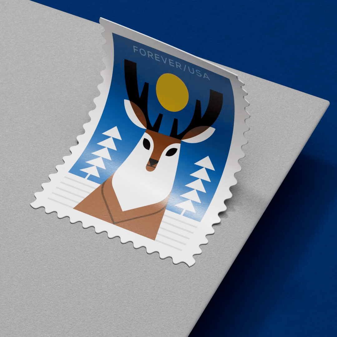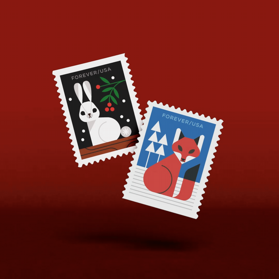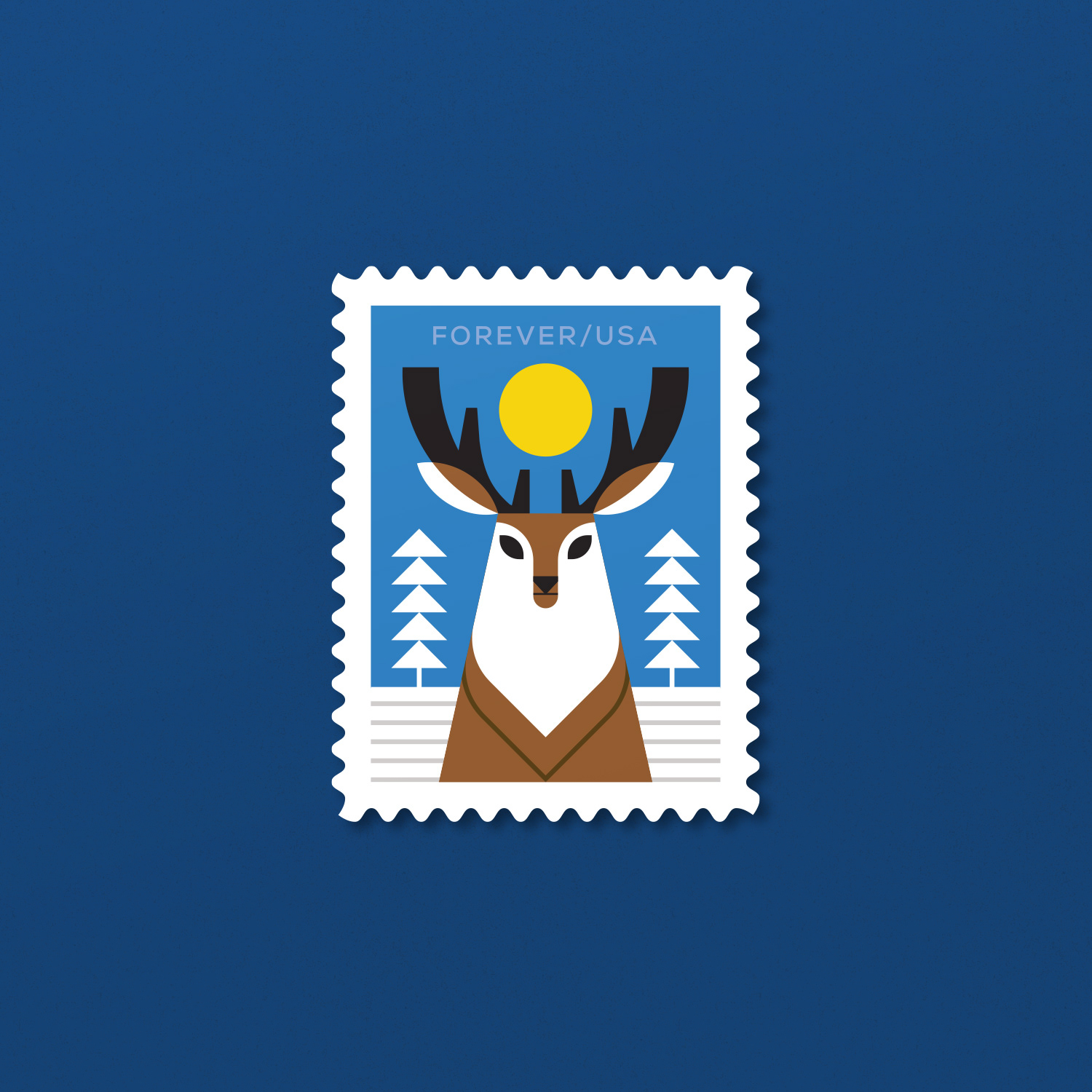 A set of four illustrated Forever stamps for the United States Postal Service. Each stamp features a North American woodland animal surrounded by the stark and ethereal beauty of the winter landscape. Art Direction by Antonio Alcalá Available online at USPS.com